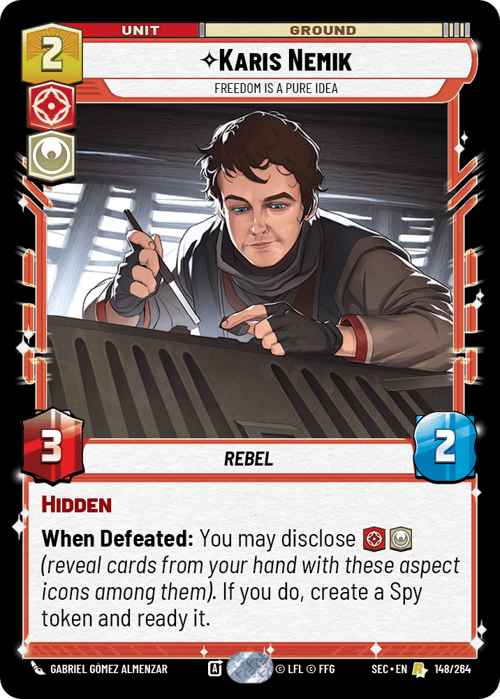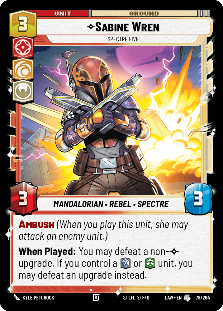 Sabine Wren: Ambush, destroys a non-unique upgrade on entry, and she’s one of our three-aspect cards alongside Luke and K-2SO. Every piece of her text is relevant. She enters fighting, she cleans up utility upgrades, and at 3/3 she’s not embarrassing if she sticks around.