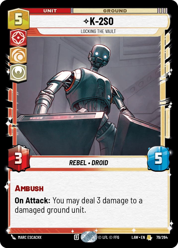 K-2SO, Locking the Vault: Ambush on a 3/5 that deals 3 damage to a damaged ground unit. In a deck full of ping effects and aggressive trades, there’s almost always a damaged unit sitting around when K-2 hits the table. He enters, removes a threat, and leaves behind a body that needs to be dealt with. Clean, efficient and exactly the kind of card a Thrawn player would appreciate even in a deck built for Poe sensibilities.Probably more of a utility card than truly a closer, but hey, I had to write about him somewhere.