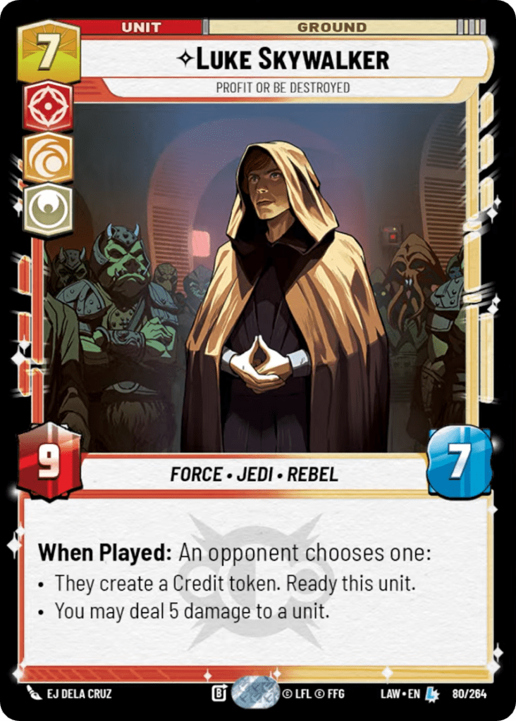 Luke Skywalker, Profit or be Destroyed: One of the two cards that started this whole project, and I still think he earns his spot. A 9/7 for 7 (no aspect penalties, thanks to our base choice) with a When Played that presents your opponent with two pretty terrible options. Option one: they create a Credit token and Luke readies, which means you’re swinging with a 9-power unit that’s already standing. Option two: you deal 5 damage to a unit of your choice, which removes most things from the board. I’ve always loved cards that redefine the terms of engagement the moment they arrive, and Luke certainly qualifies. One important thing to note with this type of card is that your opponent always chooses the option that is least punishing for them and I’ve learned from a lot of years of card gaming that usually significantly hampers the overall power level of the card. Still I think in a deck like this either option offers you significant upside and the bigger question might be how often you can go to 7 resources.