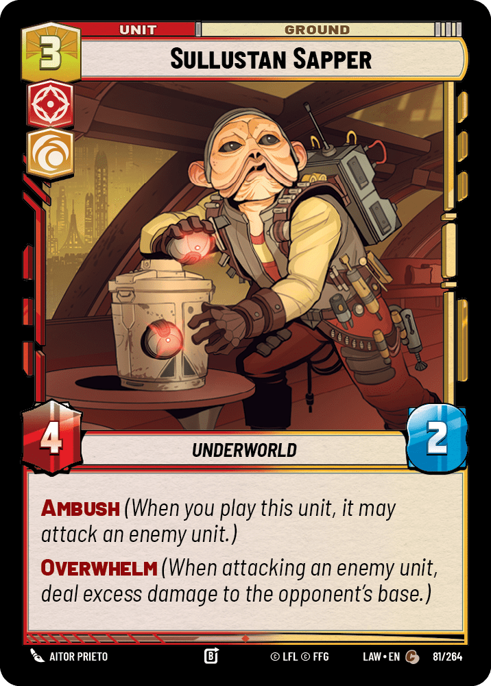 Sullustan Sapper: Four power, Ambush and Overwhelm. At three cost. I’ll let that sink in for a second. In a deck that wants units to attack and trade, having a unit that enters the battlefield already fighting is premium. He’s likely to die in that attack, so Luthen is triggering, letting you take out a 5 HP unit for 3, if needed, or keep pinging more damage to base on top of his Overwhelm if there are smaller bodies available. Think of this more as a removal event than a unit.