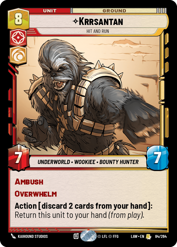 Krrsantan, Hit and Run: The other half of our pre-release haul, and the inevitability piece. A 7/7 Ambush Overwhelm for 8 is already a beating, but the ability to discard 2 cards to bounce him back to hand means you can keep him alive to replay him for another Ambush entry next turn. In a deck that’s drawing three cards off Oppression Breeds Rebellion, you should have the hand to fuel it. Each re-entry is another 7-damage minimum with Overwhelm pushing excess through to base. I’ll admit this is the greediest slot in the deck — 8 cost is a lot for even a build that I’m trying to push into midrange, but the keyword combo allowing him to remove nearly any ground threat as well as a high chance of pushing through the final damage to base has me intrigued. Whether that’s worth the curve hit is something I’m still evaluating.
