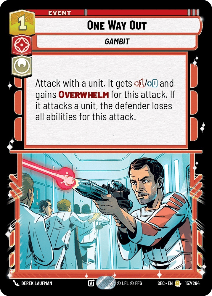 One Way Out: The backbone. One cost, attack with a unit, it gets +1/+0 and Overwhelm, and the defender loses all abilities. This lets your disposable units punch clean through anything your opponent puts in front of them. Three copies because it’s almost never dead in your hand.