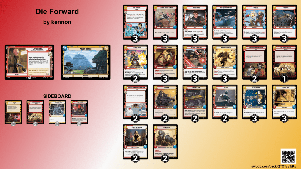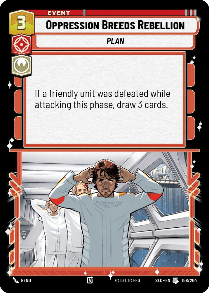Oppression Breeds Rebellion: The payoff card that ties the entire machine together. If a friendly unit was defeated while attacking this phase, draw three cards. In a Luthen deck, this condition should be easy to meet. You were going to attack with your Cavern Angels X-Wing anyway. You were going to send your Valiant Commando into that Sentinel. Now you draw three cards for doing what you were already doing. In theory, this is the card that keeps an aggressive strategy from running out of gas. Two copies because drawing multiples early is awkward, but one copy per game should be all you need.