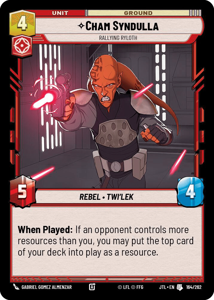 Cham Syndulla: The resource catch-up insurance for games where your aggressive starts get answered and you need to rebuild. If an opponent controls more resources than you either from acceleration on their side or your own choice to hang on to cards in hand to use as gas, Cham helps you get back on track.