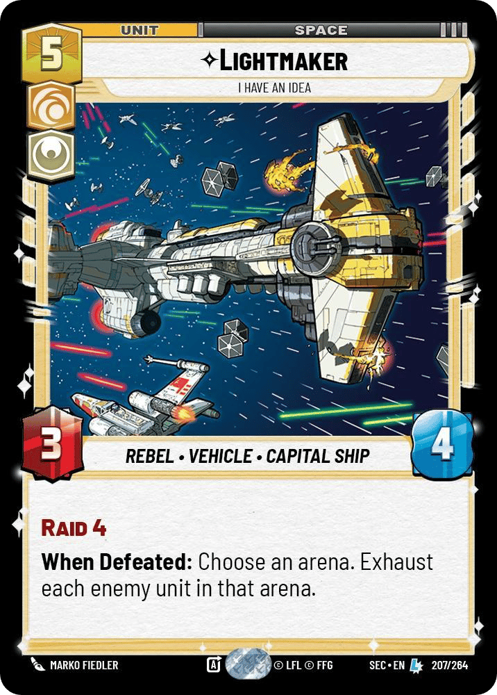 Lightmaker, I Have An Idea: Ok. I’m going to be honest with you folks. This might be my favorite card in the entire deck, and if you’ve read my stuff for any length of time, you know I don’t throw that kind of praise around casually (ok, maybe I do sometimes, but this time I really mean it). Raid 4 means it attacks as a 7/4. A five-drop hitting for 7 in space. But here’s the part that really caught my eye during deckbuilding: when Lightmaker is defeated, you choose an arena and exhaust every enemy unit in it. So your opponent faces an awkward choice. Kill it, and their board gets exhausted. Don’t kill it, and it’s hitting for 7 every turn. In theory, it’s the kind of card that generates free wins against opponents who don’t respect it. Only 4 HP for 5 cost isn’t my favorite thing, but this is the most aggressive card in the deck.