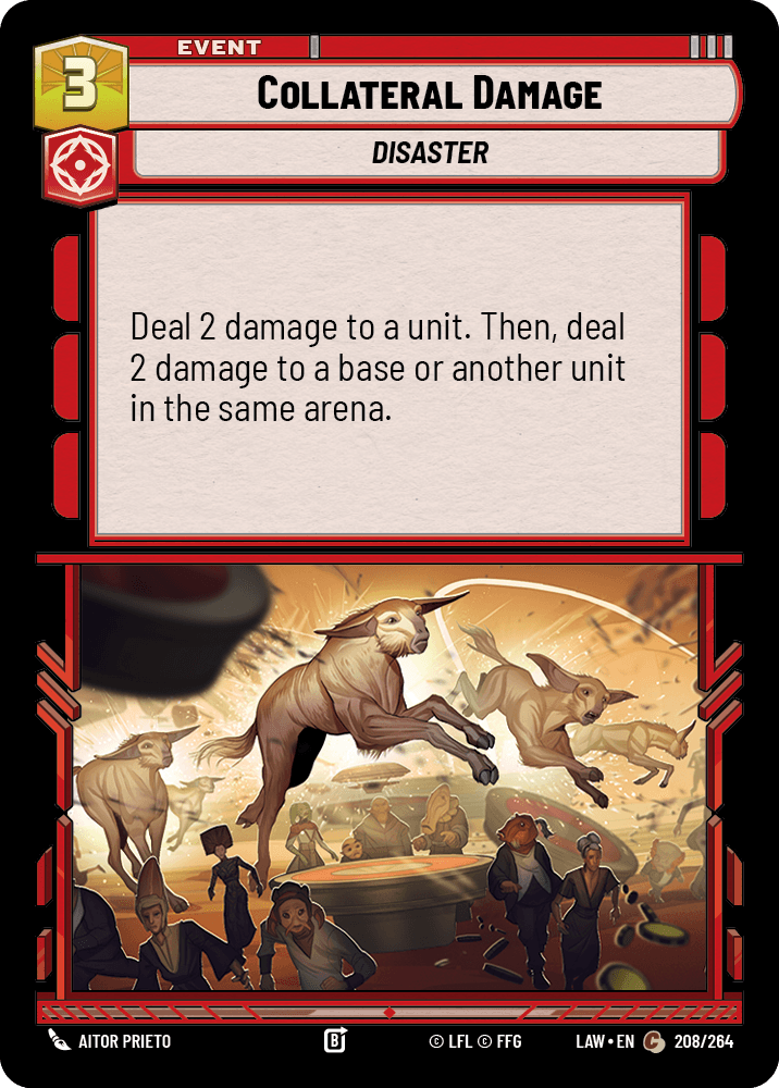 Collateral Damage: Gives us flexible removal with 2 damage to a unit, then 2 damage to a base or another unit in the same arena. One copy in the main, two more in the sideboard, because this deck’s primary removal plan is attacking, but sometimes you need to clear a path first. Combines well with other sources of damage like Luthen, K-2SO, and Red Five.