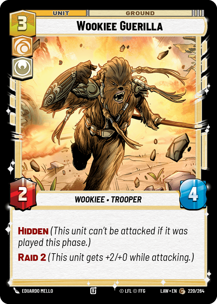 Wookiee Guerilla: Hidden plus Raid 2 on a 2/4 body. Effectively a 4/4 attacker that can’t be touched the turn it comes down. I’m running three because Hidden is quietly one of the most important keywords in a Luthen shell. You need your attacks to happen. Hidden guarantees they do.