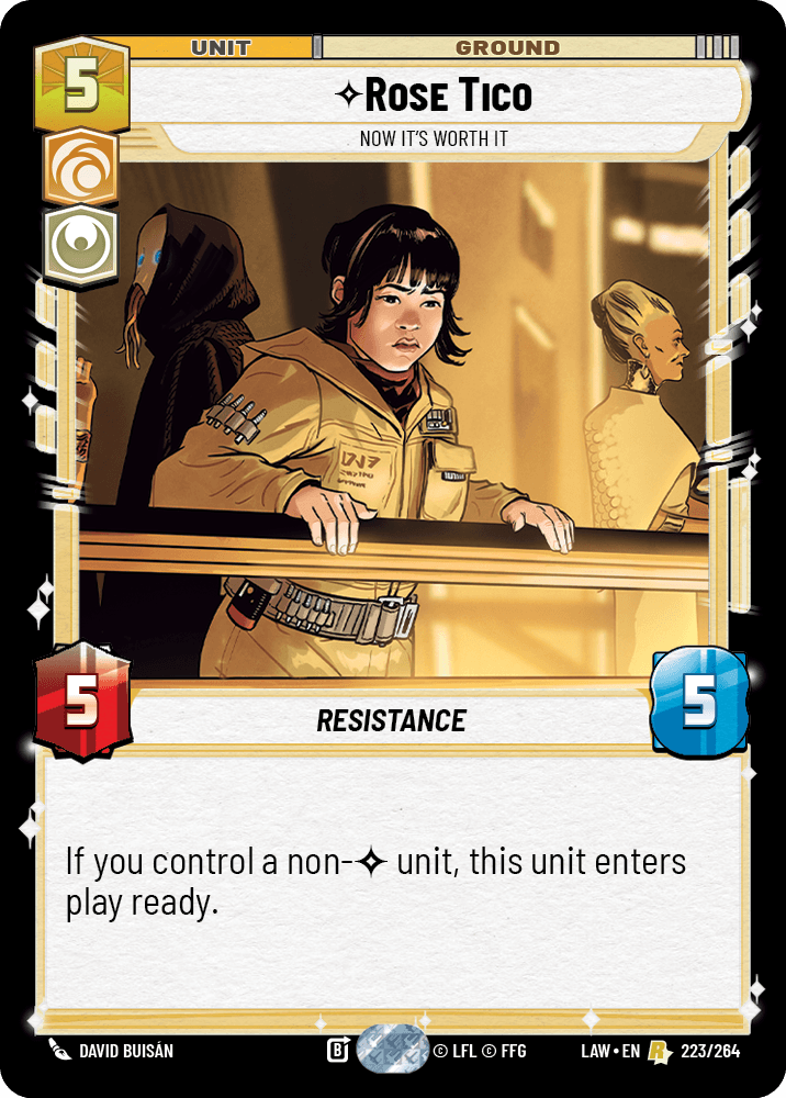 Rose Tico, Now It’s Worth It: A 5/5 for 5 that enters play ready if you control a non-unique unit. Given how packed this deck is with non-uniques, that condition should be met most of the time. Rose is functionally a 5/5 with pseudo-Ambush, and in a deck that wants to be swinging every single turn, a unit that comes down ready and applies immediate pressure is exactly what you want in your midrange curve. And because this isn’t quite ambush, there’s some huge upside here in being able to play her and go to base unexpectedly all in one turn.
